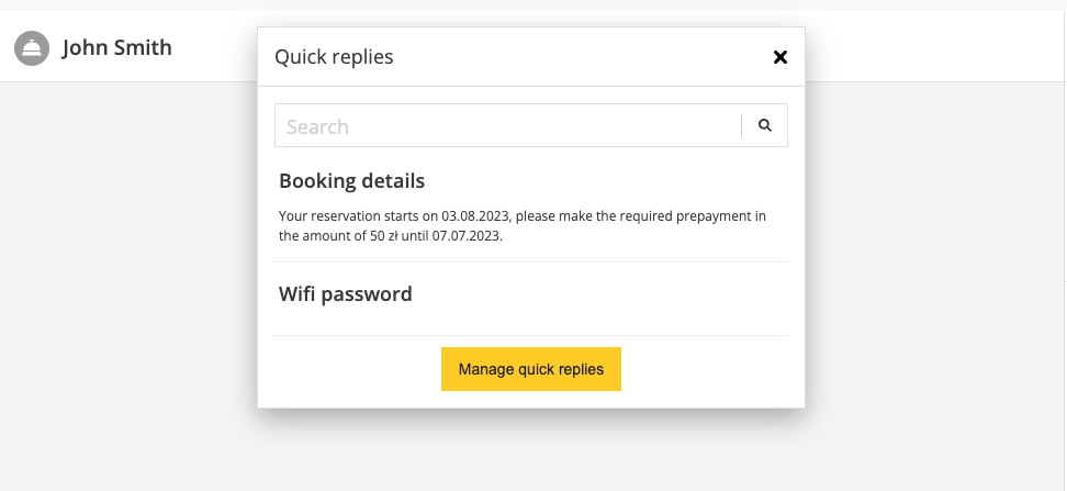 It is also possible to set up message templates to speed up the process of replying for all frequently asked questions. Each such message, together with all emails automatically sent by the system, will now be visible in the "Messages" tab. While responding to a client, you can select a quick reply from the list and instantly send it to the guest. Templates are created by simply selecting variables and entering your own content.