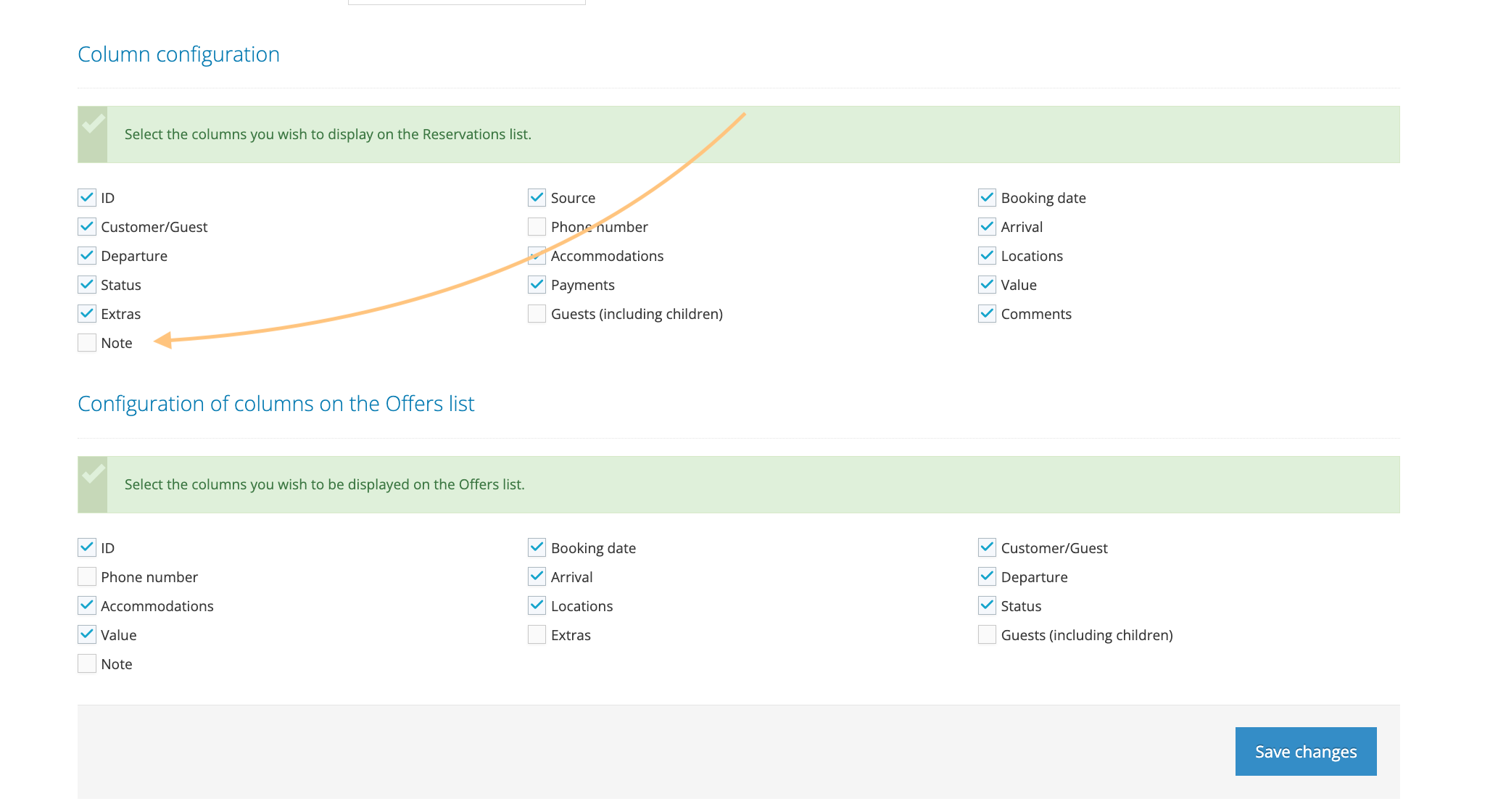 If the Availability Restrictions List is not visible in your panel, simply go to the configuration of the Reservation List view and select the appropriate column. If you want to add a Notes view, mark it in the Column Configuration section.