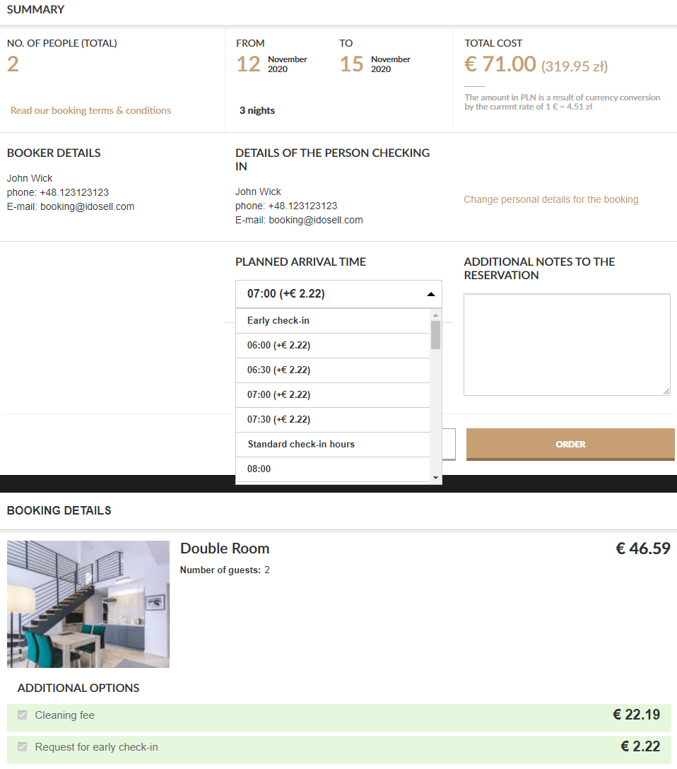 In the summary of the reservation, when choosing the Planned arrival and departure time your guests will be able to choose standard or extended hours, according to the extras settings. When choosing the extended hours, the pre-established price of the extras will be added to the total cost of the reservation.