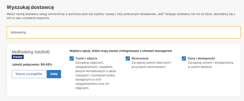 Partnerzy należący do kategorii Premier są najwyżej cenionym dostawcą, oferującym najbardziej stabilne i zaawansowane połączenie. Przed dokonaniem wyboru Channel Managera warto sprawdzić, jaką jakość usług oraz zakres funkcjonalności oferuje Twój dostawca. Możesz to sprawdzić, logując się do Extranetu Booking.com - w zakładce Konto > Dostawca usług connectivity znajdziesz listę partnerów preferowanych oraz szczegóły oferowanych integracji.