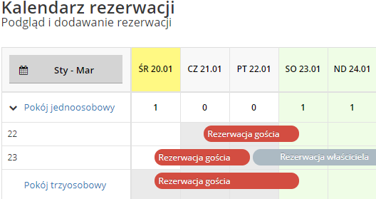 Właściciel uzyskuje dostęp do dedykowanego kalendarza rezerwacji w swoich miejscach noclegowych. Może zobaczyć terminy rezerwacji gości, oraz w wolnych dniach utworzyć własną rezerwację z notatką. Nie widzi jednak żadnych szczegółowych informacji o rezerwacjach.